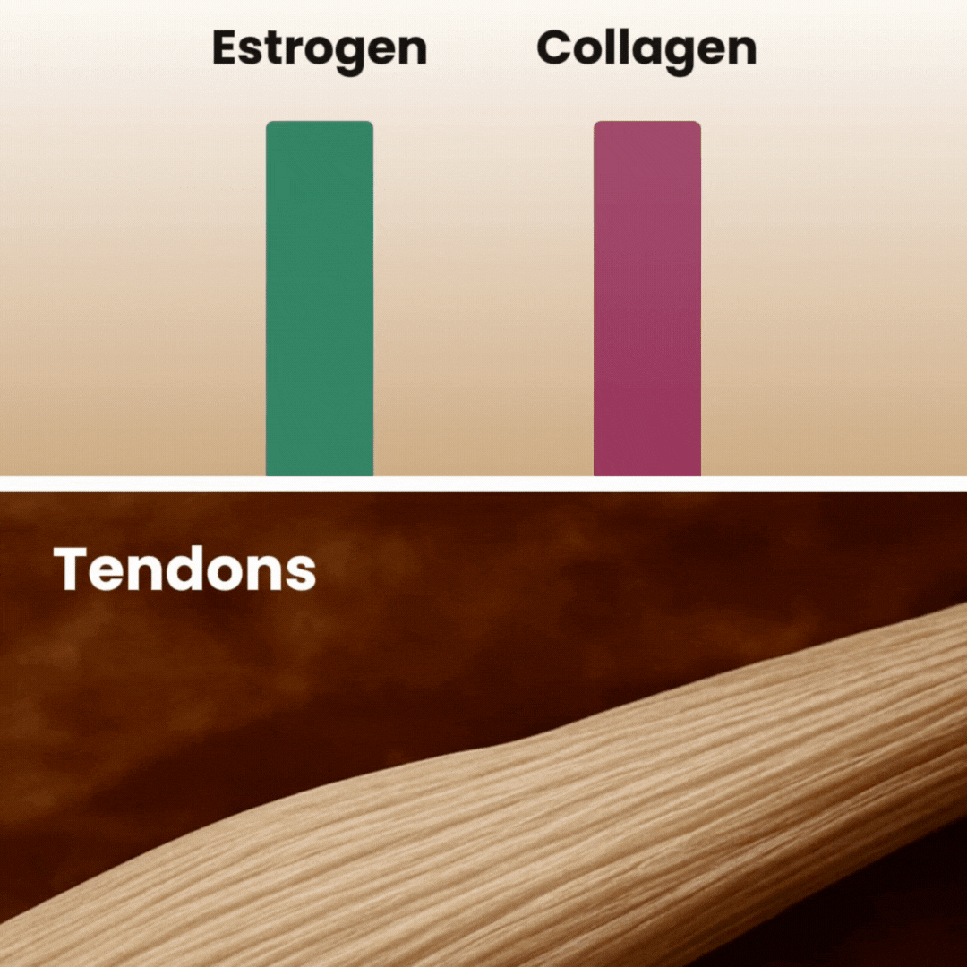 Wenn der Östrogenspiegel in den Wechseljahren sinkt, verlangsamt sich die Kollagenproduktion. Das bedeutet, dass Ihre Sehnen nicht die Rohstoffe erhalten, die sie zur Heilung benötigen.